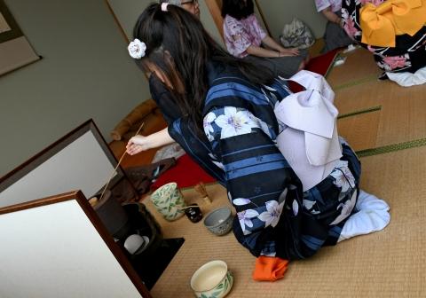 私たちは週1回水曜日の放課後に、JOYホール1階の和室で楽しく活動しています。現在は1年生5名、2年生2名で作法の基本から学んでいます。中には別の部と兼部している部員もいます。 難しい作法や手順もありますが、日本の伝統的な「おもてなし」の心を学ぶことは将来きっと役に立つと思います。和室の畳に座ると普段の学校生活の緊張もほぐれます。何より毎回美味しいお菓子と抹茶をいただくのを楽しみに頑張ってお稽古しています。 文化祭で浴衣を着てお茶会を開いたり、海外からお客様がいらしたときにおもてなしをしたり、県内の高校の茶道部が集まる研修会に参加したり、日頃の稽古の成果を披露する機会もあります。 |